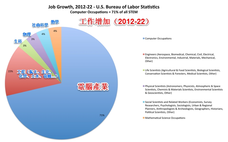美國勞工局2012-2022工作機會成長預估增加幅度,電腦資訊產業占71%