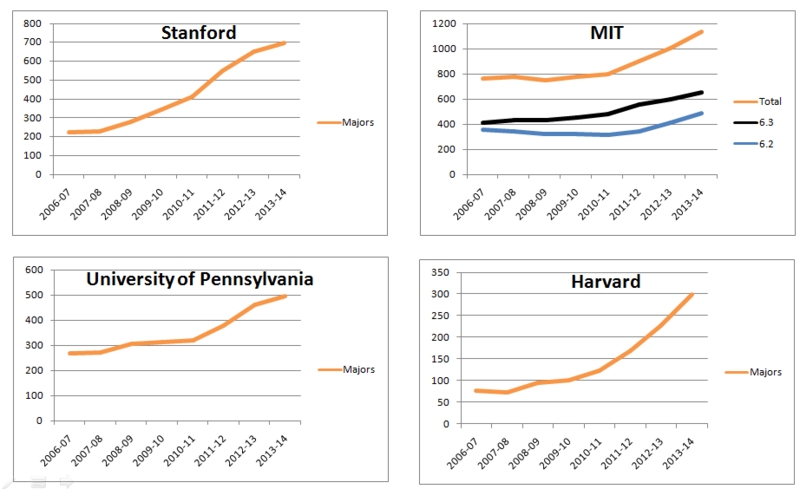 哈佛大學,近七年翻了六、七倍,理工名校史丹福和麻省理工也都成長兩到三倍