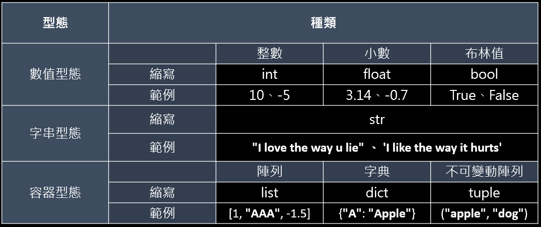 Python 的變數型態主要分為以下三類